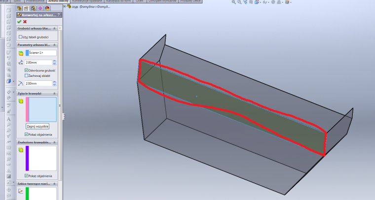 Witam, Mecze sie z przekonwertowaniem bryly na arkusz blachi jego rozlozeniem. Nie moge przekonwertowac tej bryly a juz nie wspomne o jej rozlozeniu. Czytalem poradnik, niestety tez mi nie pomogl. Dolaczam bryle w linku. Rysowane w SW 2012. Z kazda pomoc dziekuje, Pozdrawiam Link: http://BoxingSport.pl/~bryn1u/sw/zsyp.SLDPRT |