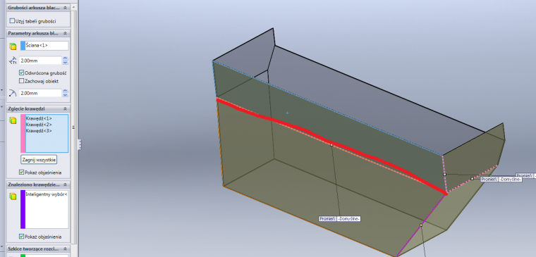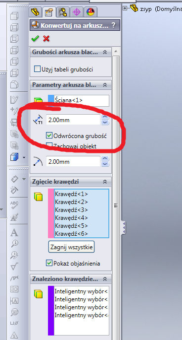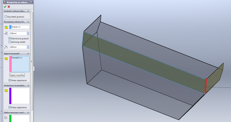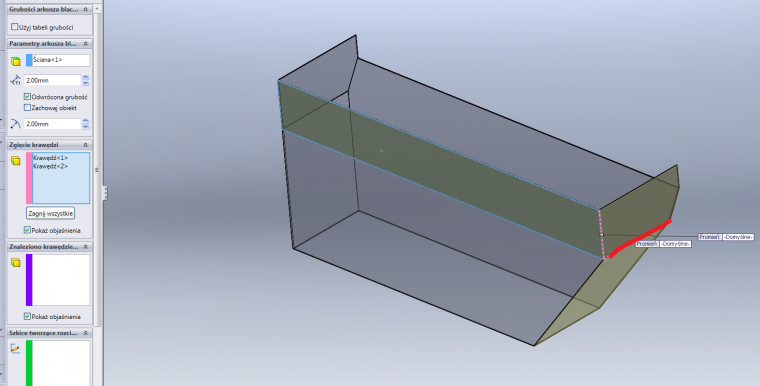 Moglbys mi napisac, ktora u Ciebie to jest sciana jeden ? W opcji: parametry arkusza blachy. Bo mi w ogole nie wykrywa krawedzi do zgiecia. |