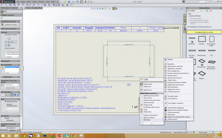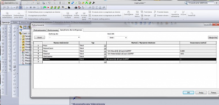 Oto ten tutorial. Sprawa jest prosta. Najpierw otwieramy szablon modelu części : ![]() Potem otwieramy edytor dostosowanych właściwości ( Plik>Właściwości ): ![]() ![]() i dopisujemy właściwość 'Grubosc". Zapisujemy szablon części. Teraz otwieramy szablon rysunku części i Tworzymy notatkę : ![]() Zapisujemy szablon i gotowe. PS. Drobna poprawka , tekst notatki ma mieć parametr Grubosc zapisany w cudzysłowiu.( $PRPSHEET:"Grubosc" ) |