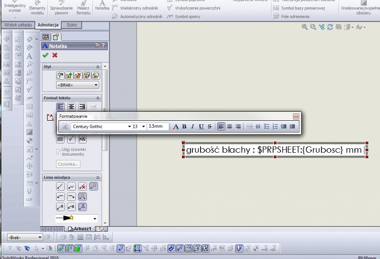 Próbowałeś dodać Notatkę któa jest powiązana z modelem "Modelu w widoku określonego we właściwościach akrusza" któa bedzie się odnośiła do właściwośći dostosowanej cześci tj. "Grubość" ? Wydaje mi się że u mnie działa to bez problemu. |