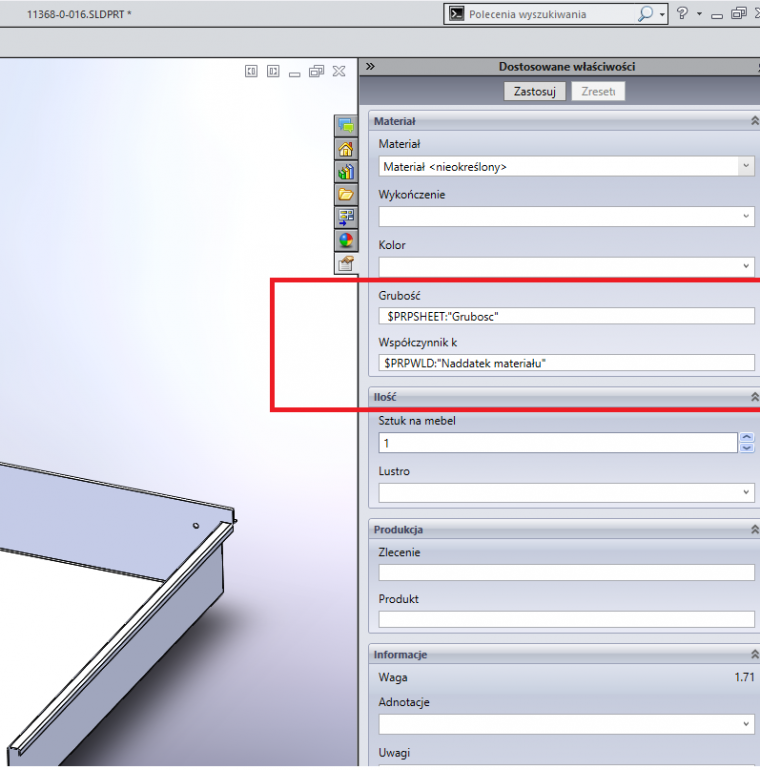 Dzięki za odpowiedź. Widzę, że używasz dokładnie tej samej metody co ja. Ja jednak szukam teraz, czegoś troszeczkę innego. Może zapytam inaczej. Jak wrzucić do karty własciwości, grubość materiał i wspóczynnik k. Aby to zrobić musiał bym jakoś dobrać się do właściwości które można znaleź klikajać na rysunek rozłożonego modelu: adnotacje, właściwośći listy elementów ciętych (widać to w moim pierwszym poście). Takich jak : Grubość arkusza blachy: $PRPWLD:"Grubość arkusza blachy" Naddatek materiału: $PRPWLD:"Naddatek materiału" Niestety po wklejeniu tego do karty wychodzi coś takiego jak na poniższym zrzucie. |