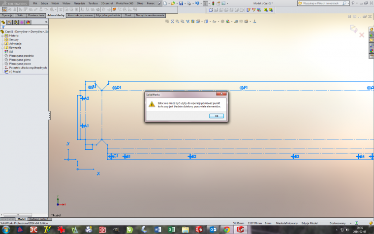 Po dokładnym usunięciu zbędnych rzecz udało się wyciągnąć blachę. Nie mogę tylko wykorzystywać gotowego szkicu (tego co użyłem do wyciągnięcia blachy) a rysuję na nim nowe linie do zagięcia i zaginanie działa. Pozdrawiam Andrzej |