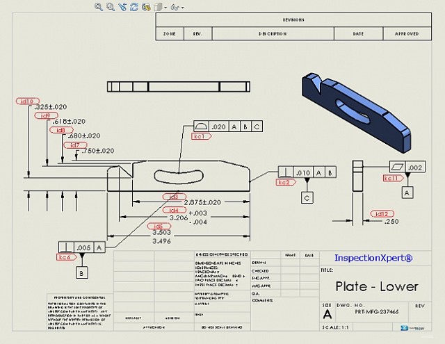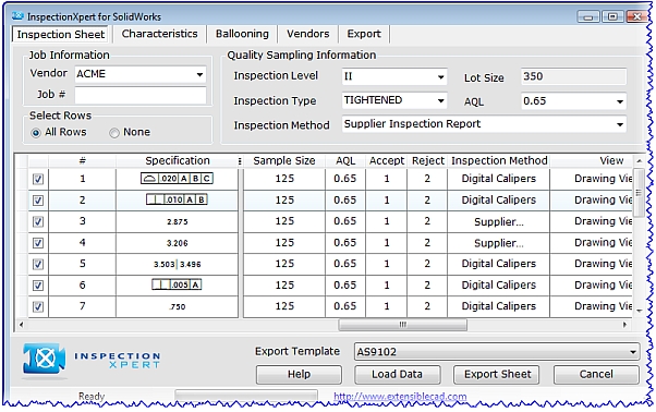 Możesz zastosować próbny plan inspekcji do formularza sprawozdania z kontroli ponieważ InspectionXpert dla SolidWorks zawiera standardy ANSI Z1.4 i MIL-STD-105E z przykładowymi tabelami umożliwiając próbkowanie wbudowanych atrybutów.