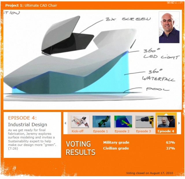 Let's Go Design i przewodnictwem Jeremiego Luchini'ego dobiega końca. Realizowanym projektem był fotel do CAD'a, jednak idea rozrosła sie do stworzenia całej przestrzeni wokół fotela, zatem finalnym produktem jest boks w pełni dostosowany do potrzeb uzytkownika CAD'a. Jak zapewnił Jeremy w jednym z ostatnich postów projekt jest już gotowy, więc wszyscy oczekujemy zobaczenia go w pełnej krasie w następnym (prawdopodobnie ostatnim) epizodzie tej serii. Prace projektowe, analizy: ruchu oraz wytrzymałościwe zostaly w całości wykonane w oprogramowaniu SolidWorks. Miejmy nadzieję, że cykl Let's Go Design nie poprzestanie na jednym projekcie i będzie kontynował tworzenie kolejnych innowacyjnych rozwiązań wspólnie z rzeszą inżynierów z każdego zakątka świata. Poniżej wyrenderowany obraz siedziska w końcowej fazie projektowania.